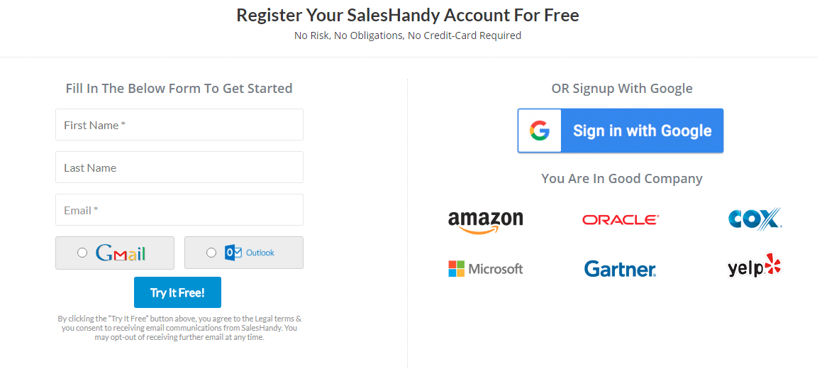 ورود به وبسایت SalesHandy: برای شروع، ابتدا باید وارد وبسایت رسمی SalesHandy شوید. این سرویس امکان ساخت حساب کاربری را به صورت رایگان یا از طریق طرحهای پرداختی فراهم میآورد. در صورتی که از قبل حساب کاربری دارید، میتوانید مستقیماً وارد شوید. همچنین امکان ورود با استفاده از اکانت گوگل یا مایکروسافت نیز وجود دارد.