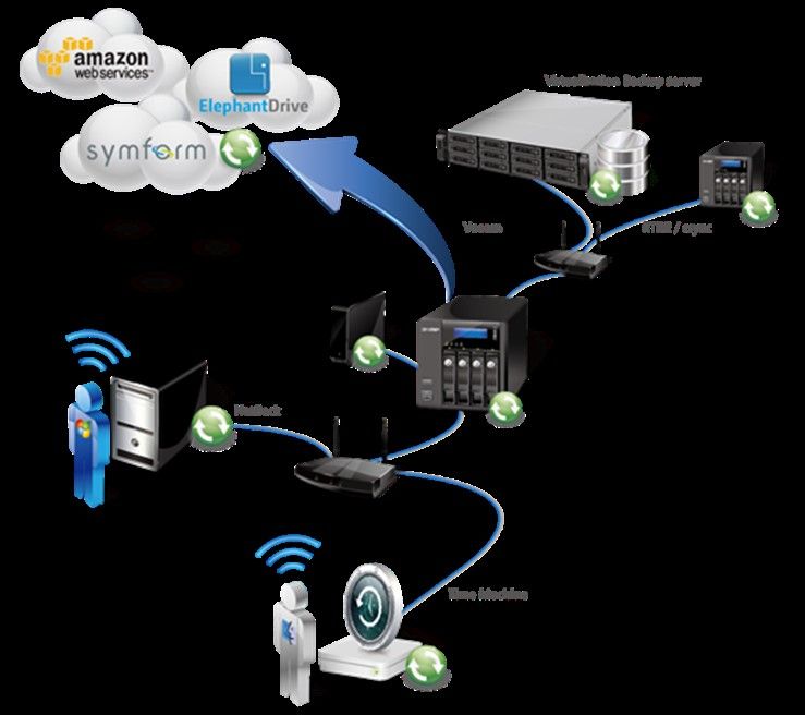 هم چنین ذخیره ساز کیونپ قابلیتی را برای پشتیبانی شبکه فراهم می کند. یعنی از درایوهای خارجی پشتیبانی می کند و داده ها را درمحیط هایی مانند ویندوز و مک بازیابی می کند. هم چنین ذخیره ساز کیونپ با نرم افزارهای پشتیبان گیری معروف در بازار مانند AcronisTrue Image، CA ARCserve Backup، Retrospect، و غیره سازگاری دارد. با استفاده از آن ها از نسخه اصلی داده ها پشتیبان گیری صورت می گیرد. علاوه بر ذخیره سازی فیزیکی، کیونپ از ذخیره سازی و پشتیبان گیری در فضای ابری نیز استفاده می کند. در سرویس های ذخیره ساز محیط ابری مانند Amazon S3، Elephant Drive از داده های نسخه پشتیبان تهیه می شود.